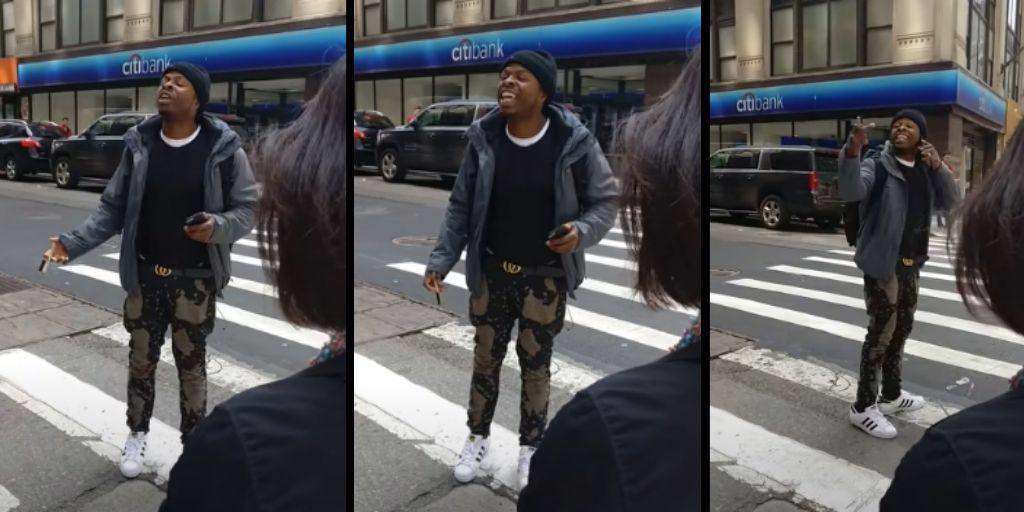An African American is seen abusing an Asian … New York in April 2018.