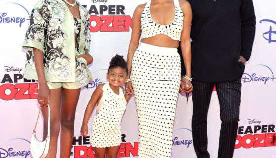 Kaavia nailed Isabella's look in a long black wig with a purple flower in her hair, a matching dress, jewelry, and eyeshadow.
