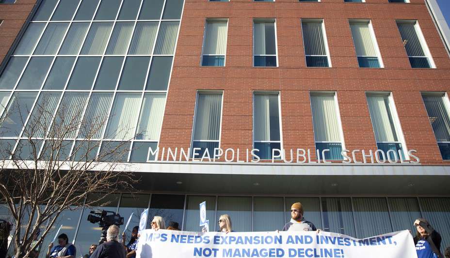 Hundreds of educators and parents rallied in front of the Minneapolis School District headquarters to protest proposed budget cuts.
