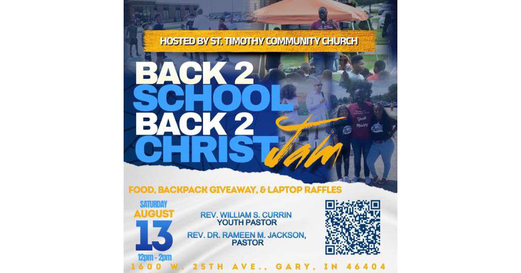 St. Timothy Community Church cordially invites the community to its 2nd Annual Back 2 School/Back 2 Christ Jam on August 13, 2022 from 12:00 p.m. - 2:00 p.m. Backpacks and school supplies will be distributed, and a limited amount of laptops will be raffled. Special guests include City of Gary officials, I Am Them Foundation, The … St. Timothy Community Church to host its 2nd annual Back to School Back 2 Christ Jam Read More »