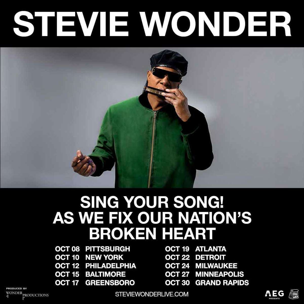Stevie Wonder has announced that he’s bringing a message of “joy over anger” this fall with his “Sing Your Song! As We Fix Our Nation’s Broken Heart” tour. The 10-show run begins on October 8 in Pittsburgh and concludes on October 30 in Grand Rapids, Michigan. This tour arrives at a crucial junction in American politics, and Wonder said he’s seeking to inspire unity and healing.