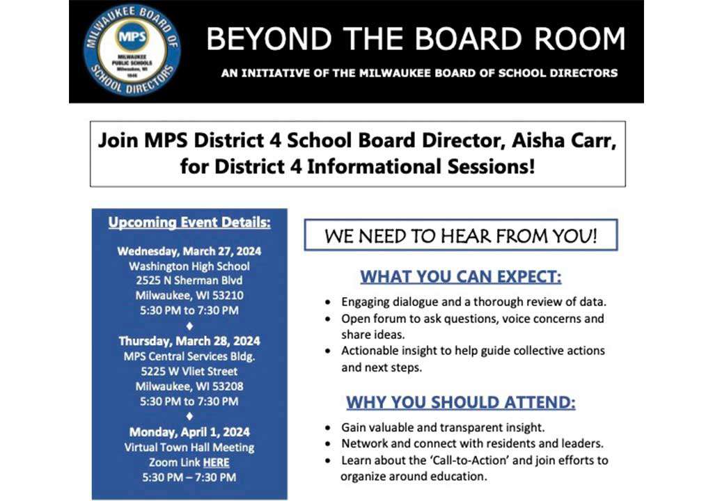 Milwaukee School Board Director, Aisha Carr, will host two Town Hall meetings. One will be held today, Wednesday, March 27th, at Washington High School located at 2525 North Sherman Blvd. […]