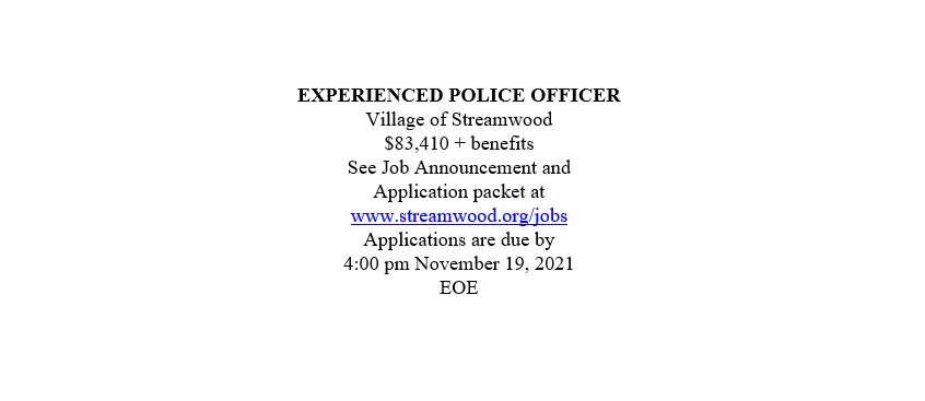 EXPERIENCED POLICE OFFICER Village of Streamwood $83,410 + benefits See Job Announcement and Application packet at www.streamwood.org/jobs Applications are due by 4:00 pm November 19, 2021 EOE
