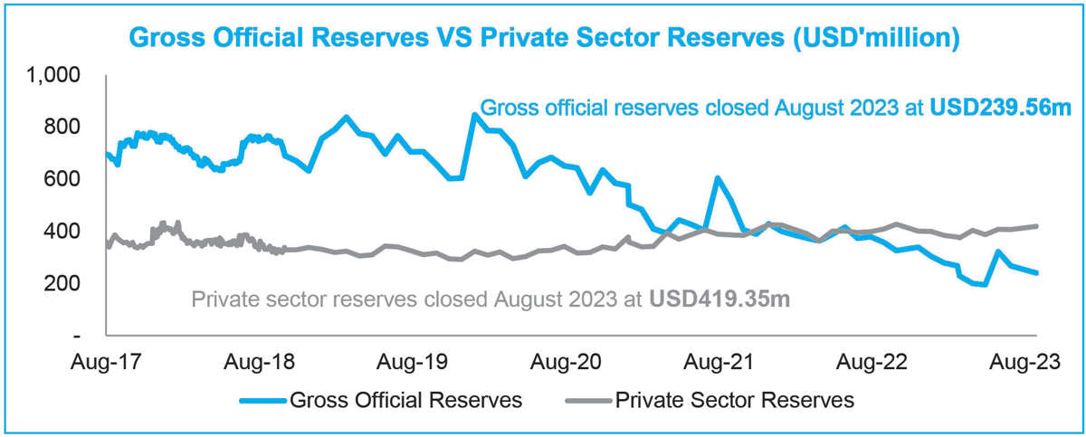 The country’s gross official foreign exchange reserves decreased by 10.6 percent to $239.56 million by August 31 2023 from $267.91 million in July 2023, a September Monthly Economic review by local financial advisory firm, Bridgepath Capital, shows. The report indicates that gross official foreign exchange reserves decreased by 10.3 percent to 0.96 months in August […]