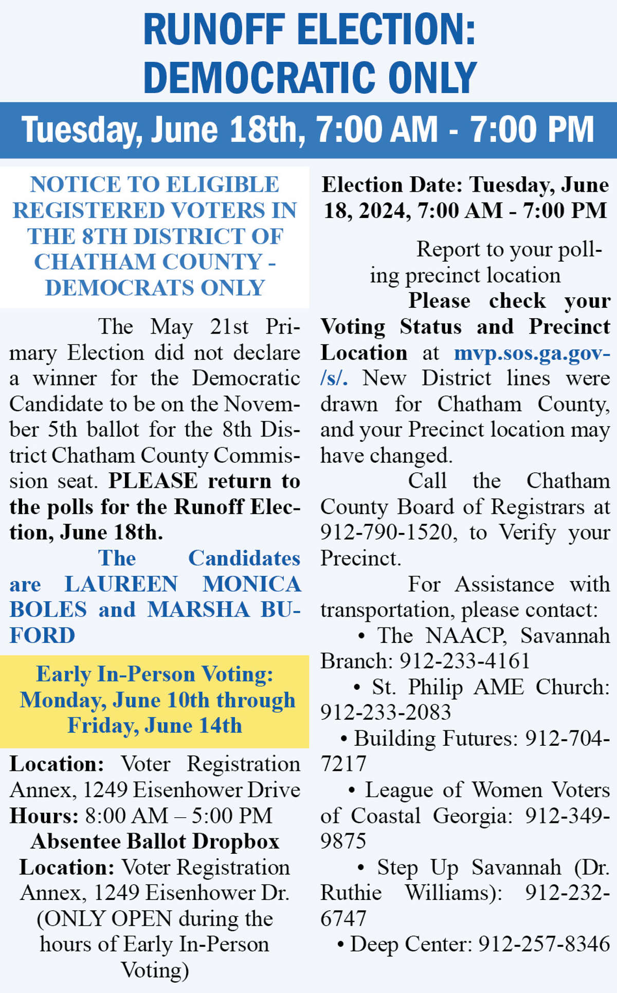 Early In-Person Voting continues December 30 & 31, 2020 at Early Voting Locations, and the last opportunity to Vote is on Election Day – January 5, 2021. The Absentee Ballot For your Official Absentee Ballot to counted, it must be received at the County Elections Office before the 7:00 pm Deadline on Jan 5th. Please hand-deliver your Absentee Ballot to … Continue reading "Vote In The January 5, 2021 - Runoff Election"