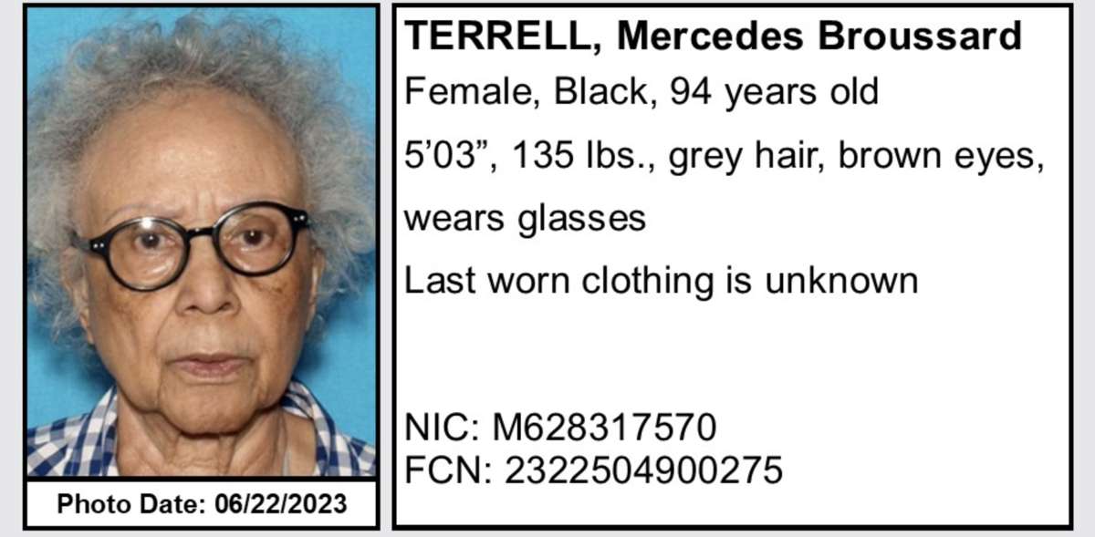 Photo courtesy of Los Angeles County Sheriff Department ALTADENA (CNS) - The Los Angeles County Sheriffs' Department's Missing Persons Unit is seeking the public's help today in locating a 94-year-old Altadena woman who authorities believe was displaced by the Eaton Fire. Mercedes Broussard Terrell last had contact with members of her family on Jan. 6. -one day before the fire, authorities said. Her last known location was on the 400 block of East Mendocino Street and Oliveras Street. Terrell is Black, 5 feet, 3 inches tall, weighs 135 pounds, has gray hair, brown eyes and wears glasses. Anyone who has seen Terrell