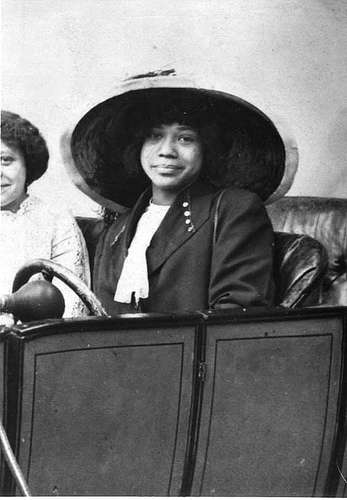 #African American woman seated in car next to another woman. She has buttons on her lapels and is wearing a large brimmed hat. c.1912 - Found On Flicker.com in Black History Album