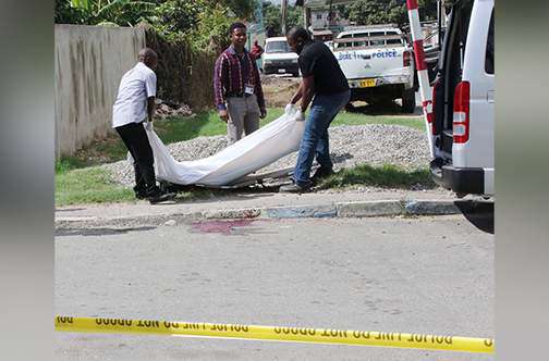 Undertakers remove the body of Richard Riley, 45, who was shot dead just a few metres from his home at 86 Balmagie Avenue in St Andrew, yesterday. According to the police, Riley, a farmer, was walking on Balmagie Avenue when a blue motor car drove up and fired shots, killing him on the spot.Photo 2: Homicide detectives on Balmagie Avenue, St Andrew, where Richard Riley was shot dead yesterday by men travelling in a blue motor car.