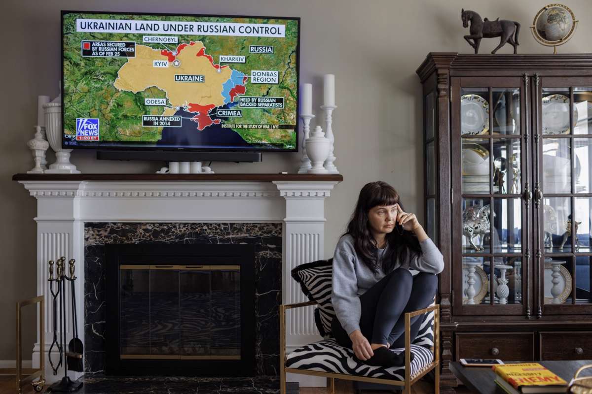 Seated in the living room of her home in Fox Chapel, Iryna Haak speaks on the phone with her mother who lives in Khmelnytskyi, Ukraine, on Saturday, Feb. 26. Amid alarming reports from family and friends in Ukraine, Pittsburgh residents with ties in the embattled country and invading Russia shared their anxiety and anger. … Continued