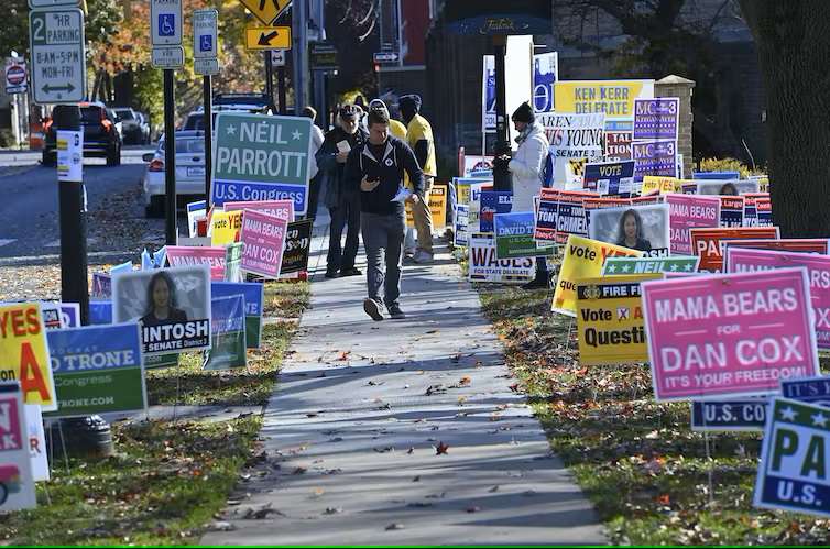 A voter walks along campaign signs nearby a polling station on Nov. 8, 2022, in Frederick, Maryland. Ricky Carioti/The Washington Post via Getty Images by Thom Reilly, Arizona State University Midterm voters in six states – Arizona, Massachusetts, Michigan, Minnesota, New Mexico and Vermont – appear to have rejected extremist secretary of state candidates … Continued