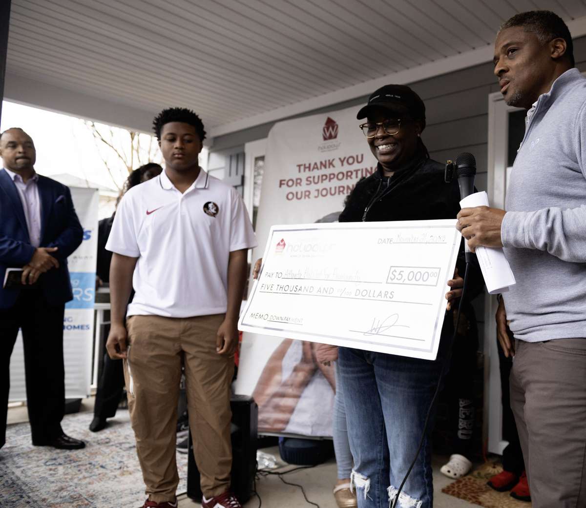 The woman wiped tears from her eyes and hugged her two children as Warrick Dunn Charities Founder Warrick Dunn welcomed them to their new home on the morning of Tuesday, Nov. 21. Despite a steady rain and cool temperatures, more than 40 people and assorted media gathered outside of a two-story home in the Sylvan Hills neighborhood to great the family and capture the moment.