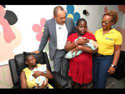 Tashannie Frazer (right), social worker at the Violence Prevention Alliance (VPA), hands over care packages to a parent at the Chatsworth Primary and Infant School in Shaw Castle, Maroon Town, St James.
